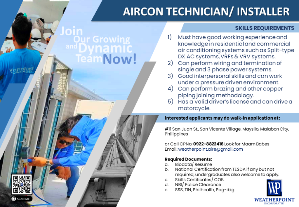 - 1)Must have good working experience and knowledge in residential and commercial air conditioning systems such as Split-type DX AC systems, VRFs & VRV systems.